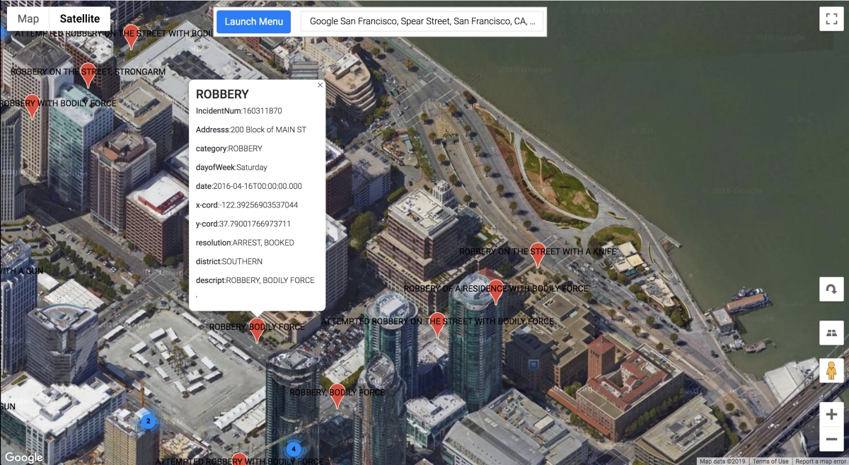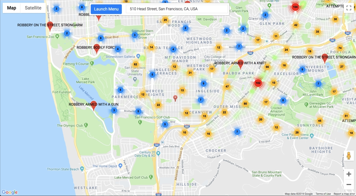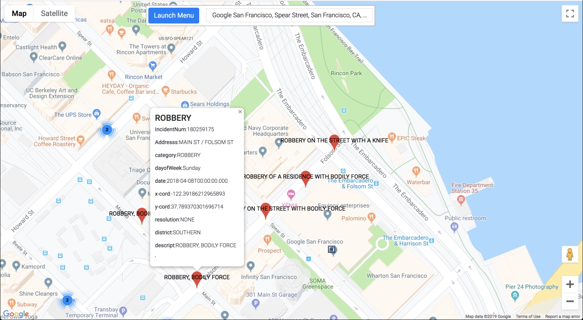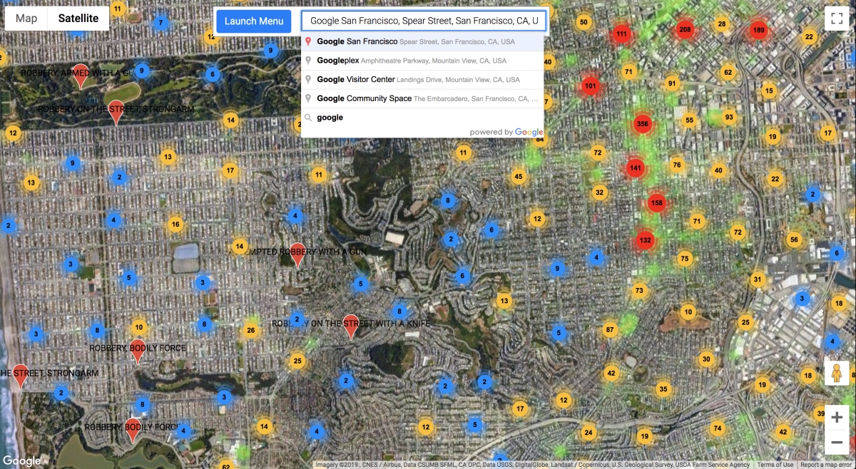 CrimeSpotter is a web application where users can search for reported crimes in any San Francisco neighborhood. The application is built using jQuery, Bootstrap, and Google Maps API. The application allows users to query hundreds of thousands of reported crimes plotted on the Google Map interface, with the information pulled straight from DataSF. Users can view this data in the form of a heat or cluster map. Additionally with the location search feature, crimes can be searched by any point of interest.